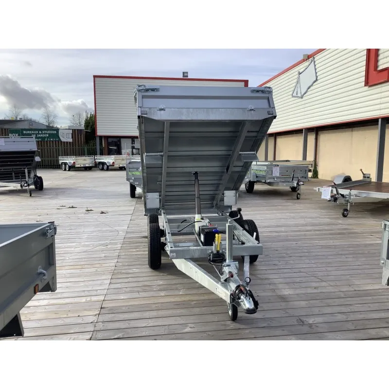 Le basculement hydraulique électrique intégré, avec pompe 12V et chargeur de batterie, permet un vidage simple et rapide, sans effort. Grâce à son freinage à inertie, son timon en V galvanisé, et ses deux essieux de 1300 kg, cette remorque garantit un confort de conduite optimal, même en pleine charge.